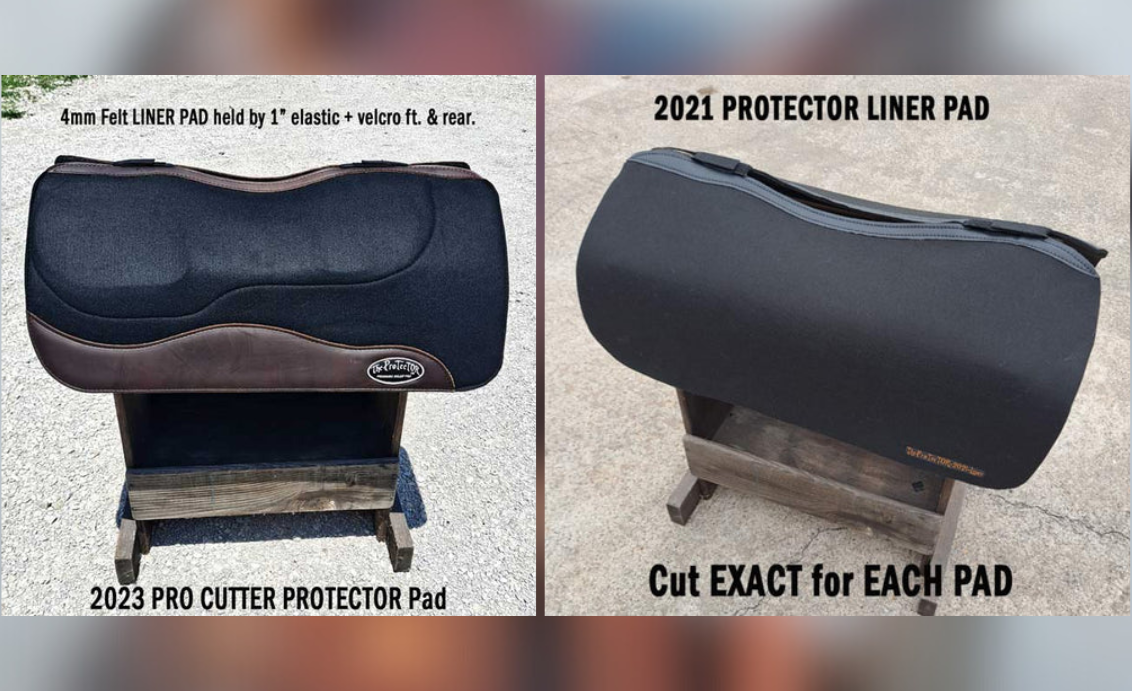 The 2023 contoured pad has a 5.5″ Cutback in front & has a Center leather re-enforcement. The 2021 Contoured is standard with a quality Felt Lower making total thickness 1/2″. Fleece version is 3/8″ felt+ Fleece. The 4mm felt liner pad has a sewn re-enforced vinyl center strip & is included with both. . The Liner is cut exactly like the Protector & is easy to remove & wash. NEVER WASH YOUR PAD AGAIN. CAUTION: The fleece is against the horse when the Liner is used. The fleece version is $30.00 extra. I send all my New SADDLES out with the Std. Protector Pads with FELT Liner. Your saddle then gets down around your horse much better.